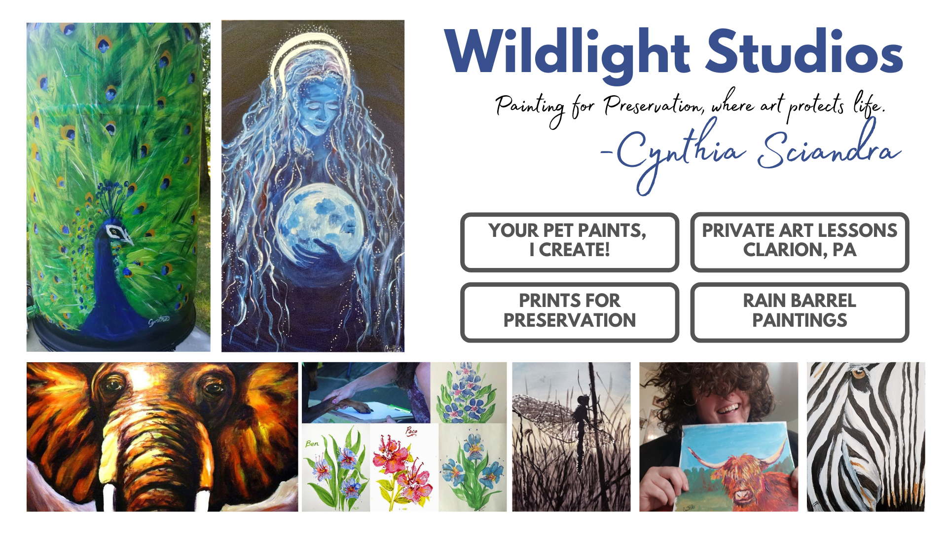 Wildlight Studios is the heart of artist Cynthia Sciandra’s work—where painting becomes preservation. Rooted in the quiet woods of Western Pennsylvania, each piece reflects a reverence for nature, myth, and the soulful bond between humans and the wild.